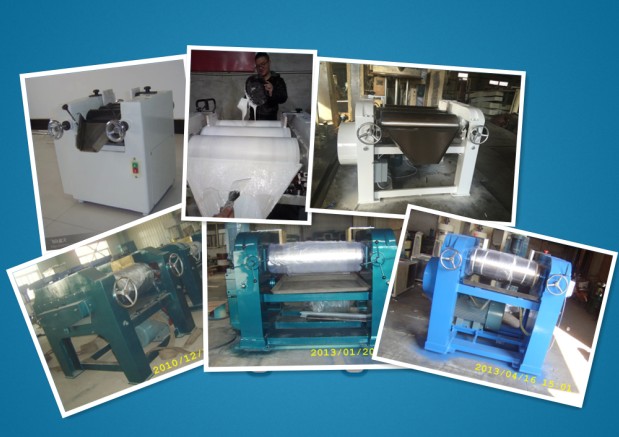 該設(shè)備由三個(gè)輥筒組成,裝在一個(gè)機(jī)架上,由電機(jī)直接帶動(dòng)。一般輥筒間的轉(zhuǎn)動(dòng)方向不同,前輥向前轉(zhuǎn)動(dòng),中輥向后轉(zhuǎn)動(dòng)。輥?zhàn)愚D(zhuǎn)速前輥快、后輥慢。中間輥固定,前后兩輥裝在滑道上,有彈簧裝置,用手輪調(diào)節(jié)前后輥與中輥的距離。物料由后輥與中輥之間進(jìn)入,受到輥筒的擠壓,產(chǎn)品顆粒變細(xì),然后由快輥帶出,快輥末端裝有刮刀,使物料與輥筒分離,落入收集桶內(nèi)。由于研磨過程產(chǎn)生大量熱量,各輥筒的中心是設(shè)計(jì)為空心結(jié)構(gòu),通水冷卻,保證產(chǎn)品質(zhì)量。